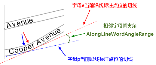 - 沿线字相对角度:设置相邻字或者字母夹角的最大值,用以保证沿线标注的美观性。取值范围为[0,90]。夹角容限值越小,标签越紧凑,但弯度大的地方可能就无法进行标注;夹角容限值越大,弯度大的地方也能显示标注,但是沿线标注的美观性就会降低,所以,从地图美观性方面考虑,在设置此值时,建议先初步计算出合适的角度值。沿线标注中字与字或者字母与字母间相对角度,如下图中所示。