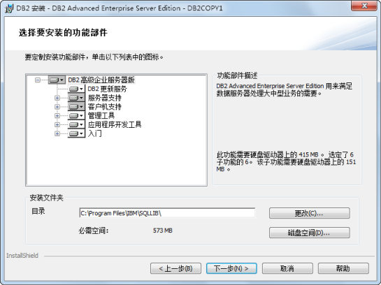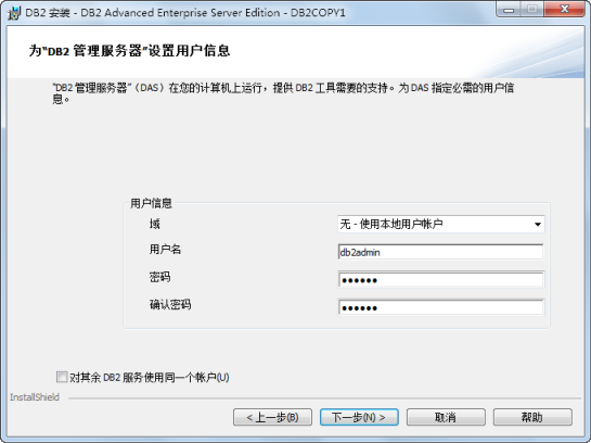 图:“选择要安装的功能部件”对话框 - 继续安装,弹出“DB2管理服务器”设置用户信息的对话框,此时你需要为DB2管理服务器设置密码,单击“下一步”按钮。