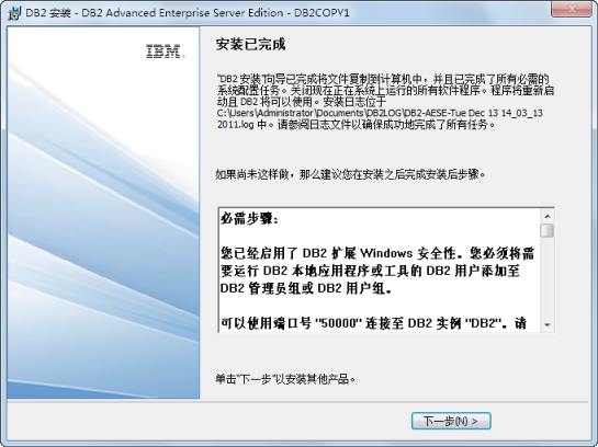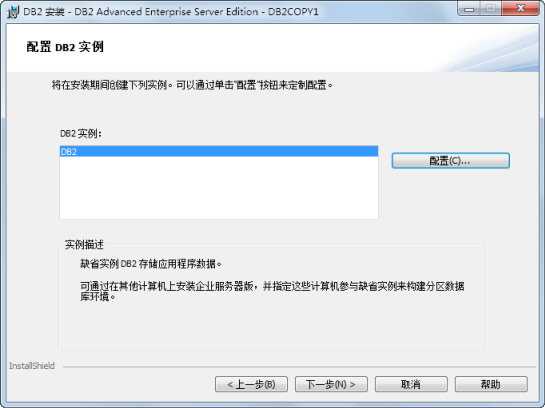 - 继续安装,弹出“配置DB2实例”对话框,如果使用缺省配置,直接单击“下一步”按钮;如果要更改“DB2”实例的配置,单击“配置”按钮。