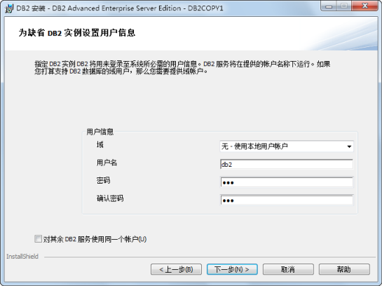 图:“DB2 实例配置”对话框 - 继续安装,弹出“配置缺省 DB2 实例”对话框,设置缺省 DB2 实例的相关用户信息。