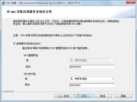 图:“对DB2对象启动操作系统安全性”对话框 - 继续安装,弹出“开始复制文件并创建响应文件”对话框。单击“完成”按钮,即可完成对 DB2 程序的安装。