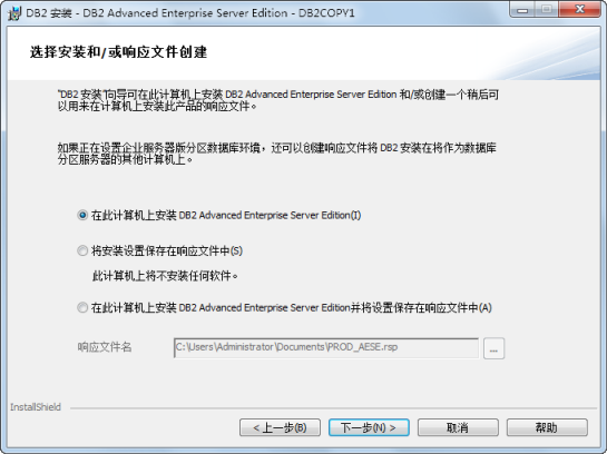 图:“选择安装和/或响应文件创建”对话框 响应文件是一个包含设置和配置值的文本文件。DB2 安装程序可读取该文件,并根据已指定的值来执行安装。通过响应文件安装也称为“静默安装”,它能提供对那些“DB2”安装向导设置的参数的访问。