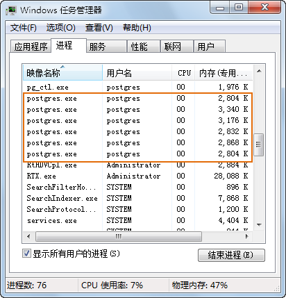 - 只启动一次服务,但却发现有很多 postgres.exe 进程。这是正常情况,因为 PostgreSQL 使用多进程体系结构,在一个无用户连接的空系统中会有 2 至 5 个进程,一旦用户开始连接,就会产生更多的 postgres.exe 进程,如下图所示。