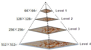 Image Pyramid is a collection of images with a series of resolutions from fine to coarse generated according to certain rules. Image Pyramid technology establishes a series of Image Layers with different resolutions through the Image Resampling Method. Each layer is divided and stored, and the corresponding Spatial Index mechanism is established, so as to improve the Display Speed when zooming and browsing images. For the Image Pyramid shown in the figure below, the bottom is the representation of the original highest resolution of the image, which is 512 × 512 image resolution. The higher the image is, the smaller the resolution is, which is 256 × 256 and 128 × 128 respectively. The top is the image with the lowest resolution of Image Pyramid, which is 64 × 64. So this Image Pyramid has four layers, or four levels of resolution. Obviously, the higher the image resolution of the image, the more levels the Image Pyramid has. For an image with an image resolution of 2a × 2b (a > B), a pyramid of (b-6) + 1 layers will be established in SuperMap.