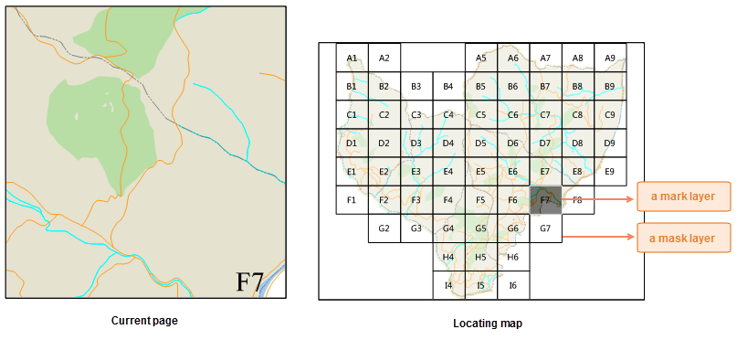- Note: The mask layer and the mark layer need to retain the attribute of the index layer. After Map Series is enabled, the positioning map will filter and display the mask and highlight layer area according to the specified current page.