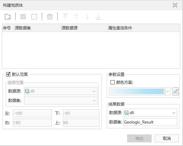 Figure: SQL Expression "Dialog Box - Result Range: Select Datasource and Dataset of Specify Range, where the selected Dataset must be consistent with the projection of the Geological Point Dataset, and the upper, lower, left and right range values can be customized. If not set, the Default range is used.