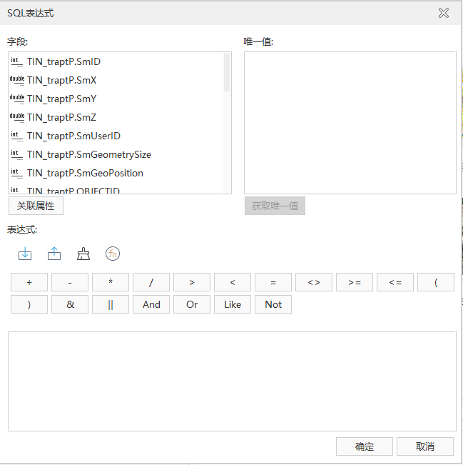 - Attribute Query Condition: It is used to query the data meeting specific conditions from the existing Point Dataset to participate in the Build Geological Body. Click the button on the right of the data mouse. The SQL Expression "dialog box pops up, as shown in the figure. The Parameter Settings in the SQL Expression "dialog refers to the Query by SQL statement .