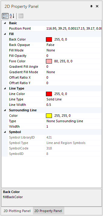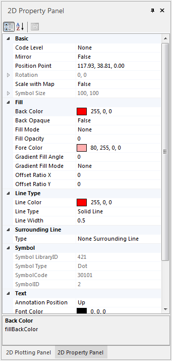 The 2D Properties Panel provides point labels, Line and Region Symbols, and primitive Attribute modifications such as Symbol Size, Mirror, Fill, Text Content, Linetype, Serif, and so on. The specific operation steps are as follows: