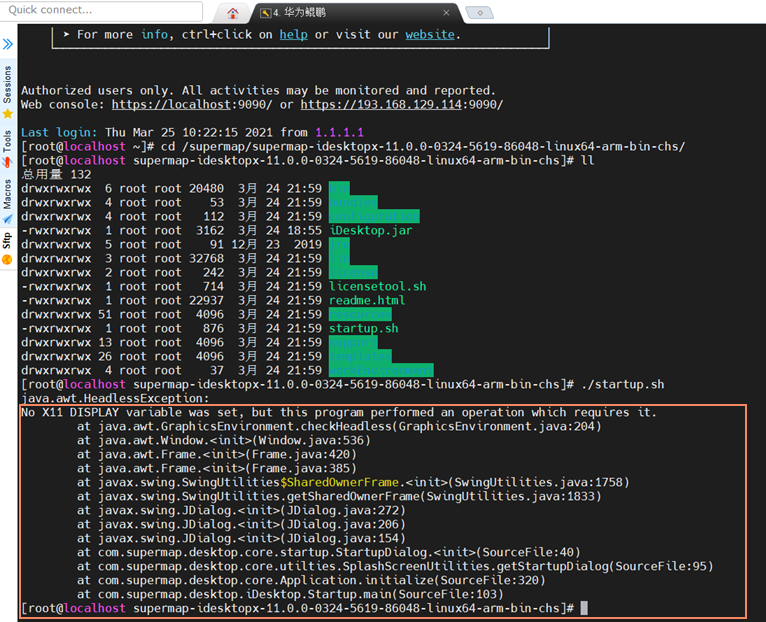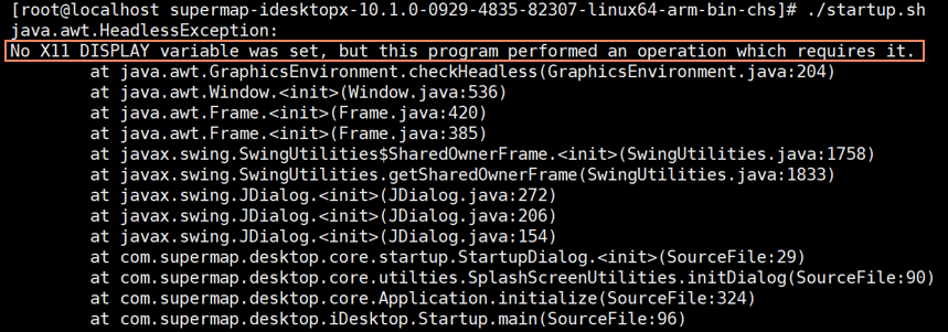 | 问6: | 在Linux系统中启动 SuperMap iDesktopX 失败,并提示"No X11 DISPLAY variable was set,……",如下图,怎么办?