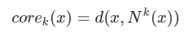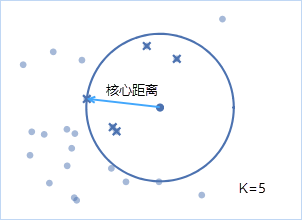 - 核心距离:当前X点到其第k近的点的距离,k为指定的聚类最小点数,并表示为corek(x),若K=5,则核心距离如下图所示。