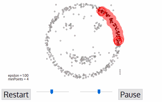 - 核心点:在聚类半径范围内,能找到最小聚类点数个临近点,就称其为核心点。