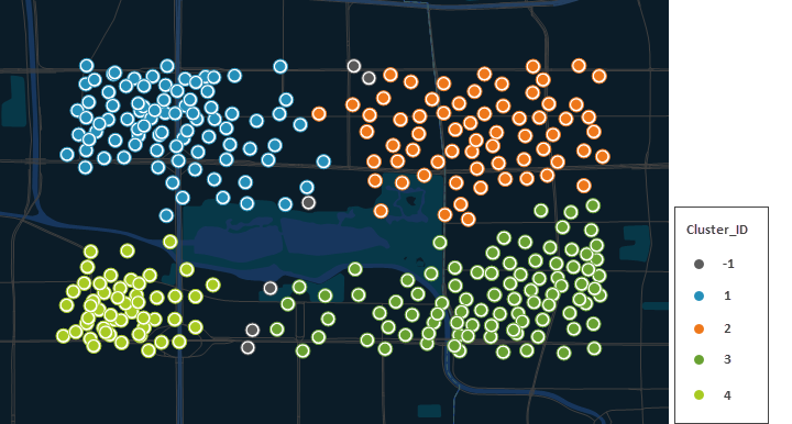 假如我们拿到了某区域某连锁餐饮店客户就餐出发点的数据,近期店里的客户较多,排号等候时间较长,为了更好的服务于客户,缩短排队时间,连锁店决定新增分店。通过密度聚类工具,可以分析客户的分布情况,在客户密集的分布区域增设分店。考虑到客户就餐距离的原因,使用顺序密度聚类的方法,对该数据进行分析,结果表明该区域餐饮店的客户可分为四个聚类,灰色(Cluster_ID = -1)为噪点,增设分店时,可在四个聚类区域内进行选址,如下图所示:
