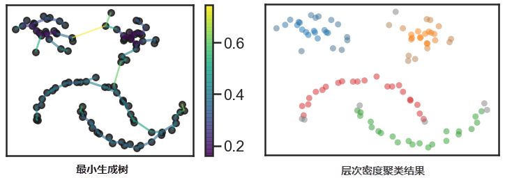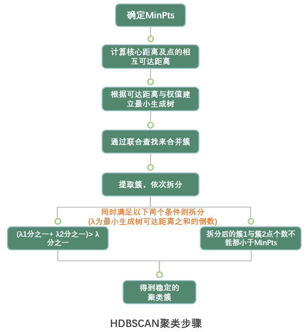 分析步骤:根据指定的MinPts,先计算点的核心距离以及相互可达距离,并构建最小生成树,通过联合查找将最小生成树进行连接合并,然后根据以下两个条件对最小生成树进行拆分,最终得到稳定性较好的聚类簇。