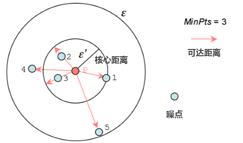 例如,下图中假设 minPts=3,聚类半径是ε。那么P点的核心距离是d(1,P),点2的可达距离是d(1,P),点3的可达距离也是d(1,P),点4的可达距离则是d(4,P)。