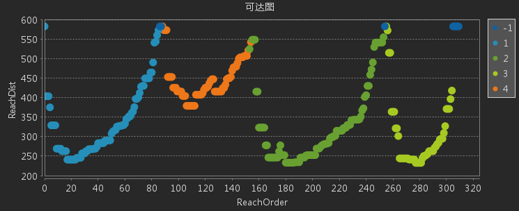 - ReachDist(可达距离):点到最邻近点的可达距离。可根据点处理顺序和可达距离创建可达图,个聚可达图可以评估聚类的紧密程度。可达距离越低,聚类越密集;可达距离越高,则聚类越稀疏,如下图,橘黄色聚类簇的可达距离较大,相比而言较稀疏。
