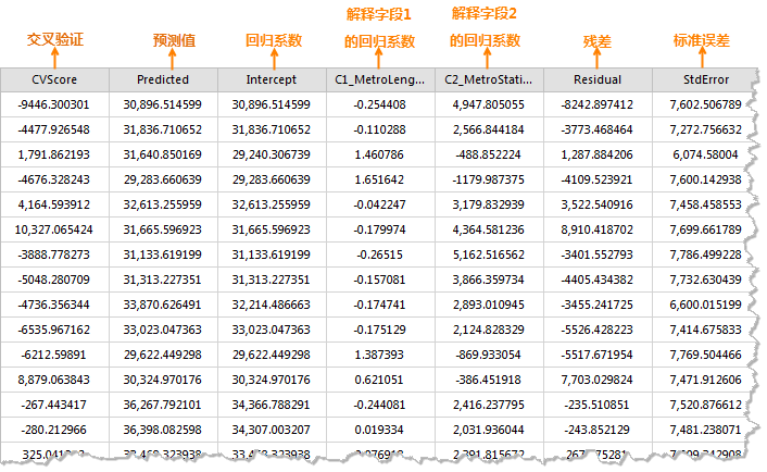 系数标准误差(SE_Intercept、SE1_ _解释字段名):这些值用于衡量每个回归系数估计值的可靠性。系数的标准误差与实际系数相比较小时,估计值的可信度会更高。较大的标准误差可能表示存在局部多重共线性问题。