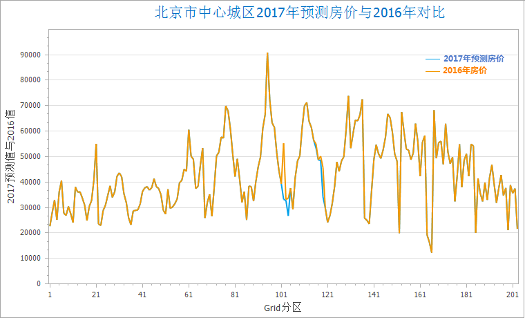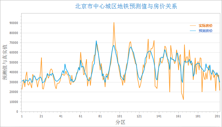 下图为地理加权回归分析的预测值与实际值的对比图,根据2016年北京市中心城区的房价,以周围的地铁站个数和地铁线路长度为解释变量,模拟出2016年北京市中心城区的房价,下图中的橘色线为实际房价蓝色线为拟合房价。