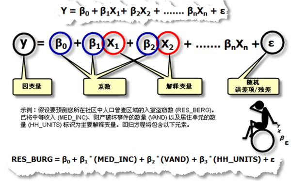 回归方程是一个可利用一个或多个解释变量对因变量进行最佳预测的数学公式。回归方程中的因变量总是标记为 y,自变量或解释变量总是标记为 X,这种表示方式对于那些将 x 和 y 视为坐标的地理学界的专业人员来说可能有些不便。每个自变量都与一个描述该变量与因变量之间关系强度和符号的回归系数相关联。回归方程的可能形式如下,其中,y 是因变量,X 是解释变量,β 是回归系数。