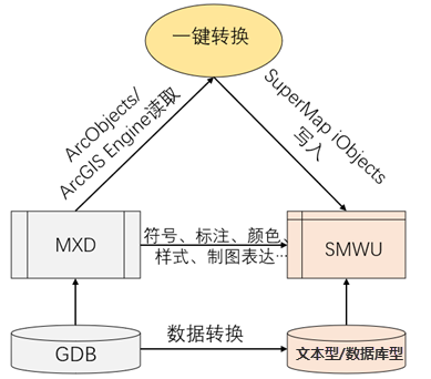 地图文档的迁移包含两部分内容,一部分是数据的迁移,详细信息请参见数据迁移;另一部分就是地图文档的迁移,主要是将 MXD 中图层、要素、标注、符号等信息对象,通过 SuperMap 提供的 iObjects java组件接口完成相应图层、要素、符号等对象的创建、写入和设置,从而完成从 ArcGIS 的 MXD 到 SuperMap 的 SMWU 的转换。