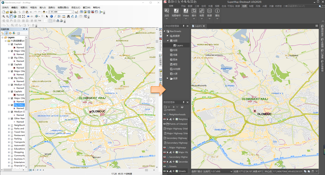 迁移完成后,程序将自动打开导入成功的工作空间,如下图即为迁移前后的效果对比图。