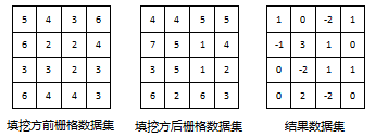 栅格填挖方计算要求输入两个栅格数据集:填挖方前的栅格数据集和填挖方后的栅格数据集,生成的结果数据集的每个像元值为这两个输入数据集对应像元值的变化值。如果像元值为正,表示该像元处的表面物质减少;如果像元值为负,表示该像元处的表面物质增加。如下图所示,以一个4*4的栅格数据显示了填挖方的计算方法: