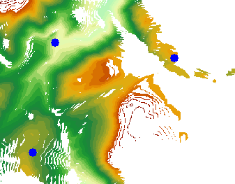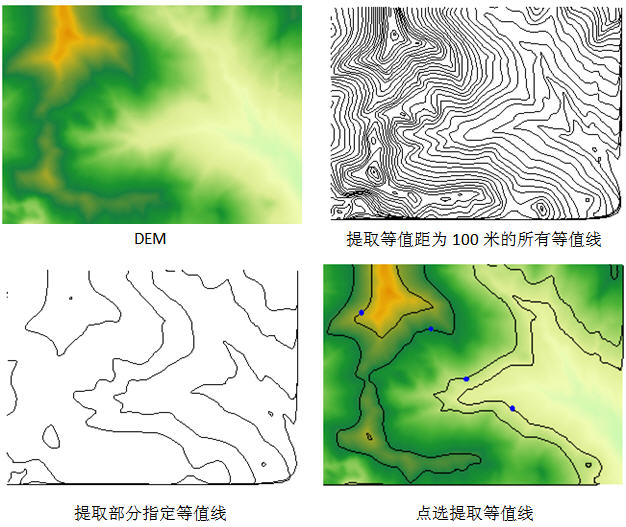 - 点选提取等值线 通过用户在栅格表面模型上点击来交互地选择等值线,结果将输出值等于选择的点的高程的等值线,注意不只是点所在的等值线。