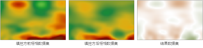 下图所示为填挖方结果示意图,分别列出了填挖方之前的源数据集、作为参考的填挖方数据集和生成的填挖方结果数据集。源数据集和填挖方数据集中,高程值越高,栅格颜色偏向棕红色;高程值越低,栅格颜色偏向绿色。在填挖方结果数据集中,需要挖方的部分用墨绿色表示,且挖方量越大,颜色越深;需要填方的部分用棕色表示,且填方量越大,颜色越深;不需要填挖方的部分用白色表示。