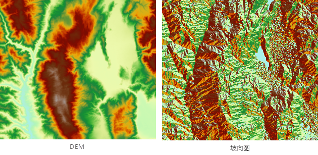 坡度和坡向是两个重要的地形特征因子,在地形表面分析中起到重要作用。其中,坡度表示地球面某一位置的高度变化率的量度;而坡度变化的方向成为坡向,表示地表面某一位置斜坡方向变化的量度。