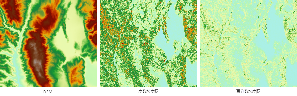 度数坡度的分析结果的范围是0到90°,0表示该处地表为水平面,90°表示该处地表为垂直于水平面的陡峭表面。百分数坡度的分析结果的范围是0到无穷大,当结果小于1时,表示该处坡度的高程增量小于水平增量,坡度较缓;当结果等于1时,表示该处坡度的高程增量等于水平增量,且坡度值为45°;当结果大于1时,表示该处坡度的高程增量大于水平增量,坡度变陡。