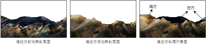 地表经常由于沉积和侵蚀等作用引起表面物质的迁移,表现为地表某些区域的表面物质增加,而某些区域的表面物质减少。在工程中,通常将表面物质的减少称为“挖方”,将表面物质的增加称为“填方”,将一种情况变为另一种情况时需要填/挖的面积和大小。下图为填挖方的地形剖面示意图。