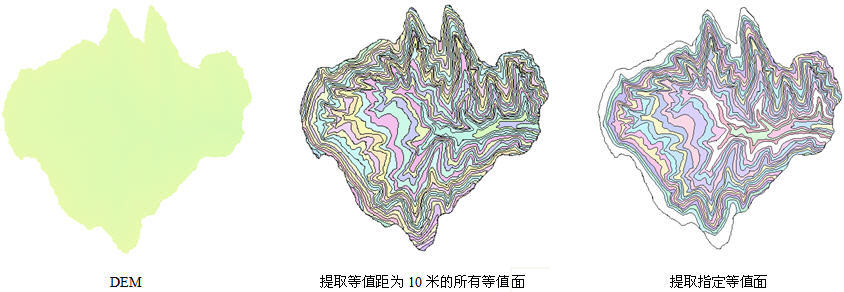 - 提取指定等值面 可以按照用户的需要指定一定数量的特定值。可以直接输入特定值,也可以根据设置的范围和间隔自动生成系列高程值。