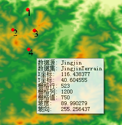 - 使用鼠标单击想要查询的栅格值,则会在地图窗口上高亮添加一个点,同时在输出窗口会显示该点的地理坐标、栅格坐标以及栅格值。 如果同时查询了多个栅格点,则会自动给这些点编号,方便用户区分。