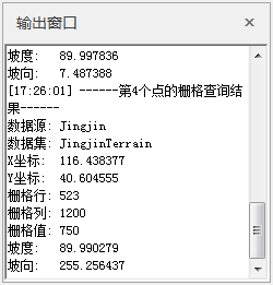 查询鼠标所在位置的栅格值。默认查询结果会显示该栅格单元所在的数据源、数据集、X坐标、Y坐标、栅格行、栅格列、栅格值、坡度以及坡向值。支持对镶嵌数据集进行栅格查询。