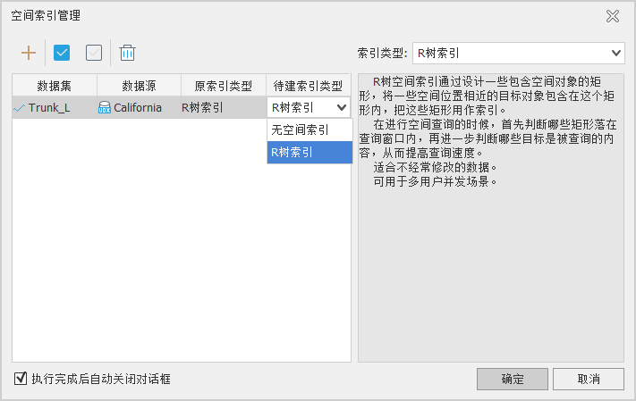 其中“原索引类型”字段,显示了所有选中的数据集的空间索引类型。如果用户想为数据集重新建立空间索引,可以通过“待建索引类型”列,为相应的数据集选择要重新建立空间索引类型。