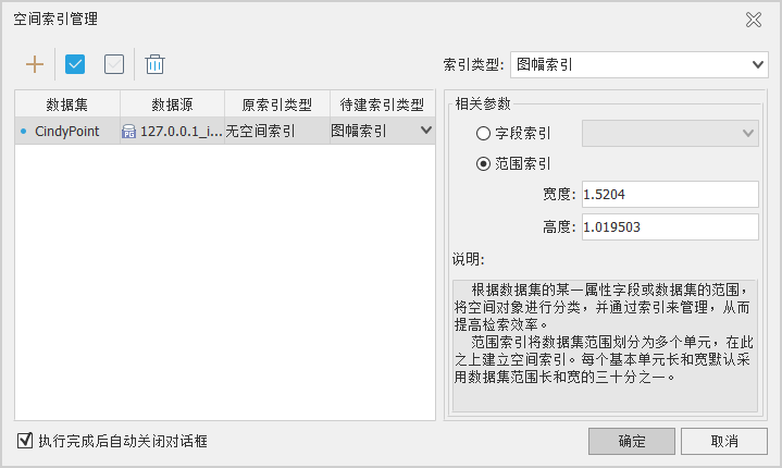 有关“空间索引管理”对话框的使用方法和说明内容,参见下文的“空间索引管理”对话框内容介绍。