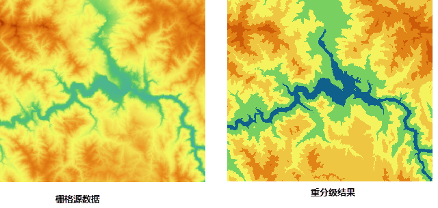 对源栅格数据的像元值进行重新分类并按照新的分类标准赋值,其结果是用新的值取代栅格数据的原有像元值。栅格重分级仅适用于栅格数据集(GRID),不适用于影像数据集(IMAGE)。