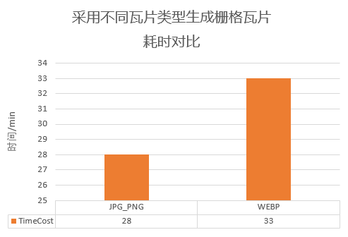 WebP格式图像的编码时间“比JPEG格式图像长8倍”。因此在相同条件下,采用WEBP格式生成栅格瓦片耗时相较其他格式长。