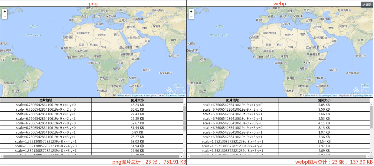 SuperMap 桌面支持直接打开WebP图片格式的瓦片,同时支持将生成的WebP瓦片发布为iSever服务,在iSever端查看。以下为世界地图瓦片发布为iSever服务后,在浏览器中分别以PNG和WebP两种表述形式查看,得到以下结果:某一比例尺下,瓦片数为23张,PNG的图片大小为751.91KB,,WebP的图片大小为137.3KB。WebP比同等PNG格式缩小文件体积80%,以此提高了页面载入速度,降低了存储需求,帮助加速网站图形效果。