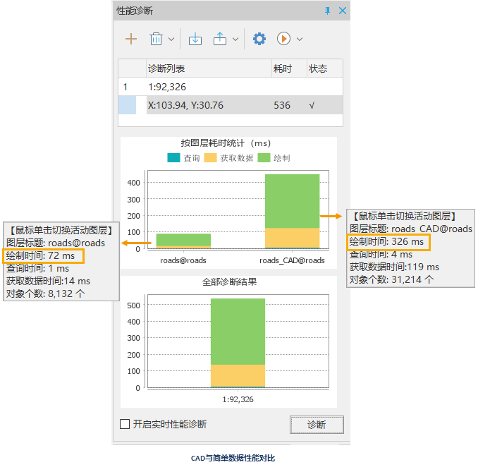 例如,对某地区的三级道路地图数据进行测试,道路数据分别使用简单线数据集存储和CAD复合数据集存储,测试两种情况下地图刷新一次的效率,结果如下图所示。在相同条件下,简单线数据集的刷新耗时约为 72 ms,CAD数据集的刷新耗时约为 326 ms。由此可见,同样内容和数据量的数据,简单类型数据集比复合类型数据集的绘制和查询时间都少,因此地图中尽量使用简单类型数据。