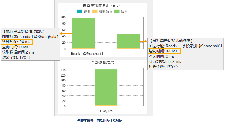 例如:对 Road_L 线数据要用于制作标签专题图,在未对该数据中字段创建索引时,诊断的图层绘制耗时为 94 ms,对用于制作标签专题图中的 NAME 字段创建字段索引之后,图层绘制耗时为 44 ms,图层的绘制耗时有所减少。由此说明,创建数据集的字段索引可提升图层的绘制效率。