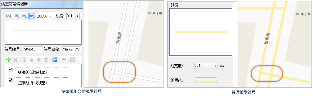 开启十字路口优化也将降低地图的性能,在允许的情况下可以选择另一种制图手段来实现十字路口优化的效果,十字路口优化功能开启后,图层的绘制性能会有所下降,这里提供一个可替代方案:出现道路交叉路口线型效果不合理,是由于使用的线型符号由两个不同风格线条叠加形成,如下图所示。将同一个道路数据添加两次到地窗口中,制作两个图层,两个道路图层都采用普通单一线条的线型符号,并设置位于上层道路的颜色为道路的填充颜色,这里设置为白色,设置一个合适的线宽;下层道路的颜色为边线的颜色,这里设置为灰色,设置的线宽要大于上个道路图层的线宽,从而模拟由两条不同风格和宽度的线条叠加而成的线型符号。这种方式道路交叉口的渲染与十字路口优化后的效果相同,但是性能却略高于开启十字路口优化功能的图层。