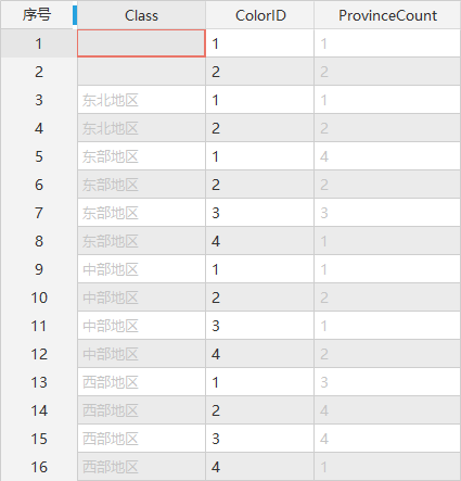 下面仍以示范数据PopulationAndEconomy数据源中的Province_R数据为例,基于各地区省份数量再按照地图的颜色进行分组统计。