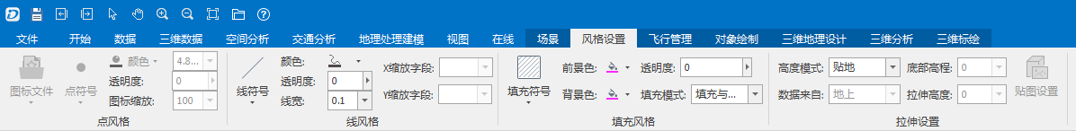 这部分主要介绍如何对场景中矢量图层的风格进行设置,以达到更好的表达效果。这部分功能主要通过“风格设置”选项卡进行实现。不仅支持对添加到场景中的矢量数据集(包括点、线、面数据集、网络数据集、路由数据集),也支持对场景矢量缓存图层进行三维图层风格设置,场景矢量缓存图层支持三维点、线、面符号设置。