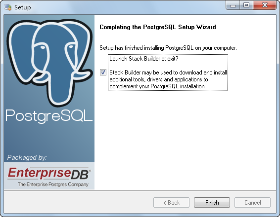 上面的安装步骤执行完成后,会弹出如下图所示的完成对话框。这里可以选择安装完成后是否运行 Stack Builder 向导来安装附加软件,以完善 PostgreSQL 的安装。该操作必须在联网状态下执行。