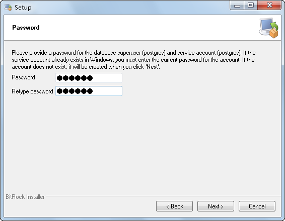 数据库超级用户是一个非管理员账户,这是为了减少黑客利用在 PostgreSQL 发现的缺陷对系统造成损害,因此需要对数据库超级用户设置密码,如下图所示,安装程序自动建立的服务用户的用户名默认为 postgres。然后,单击“Next”按钮继续安装。