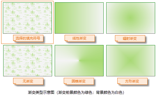 渐变填充:勾选该复选框后,将使用渐变颜色作为填充符号的填充内容,此时,填充符号的填充内容为颜色,即用户在第 1 步中选中的填充符号无效。在渐变填充模式下,前景颜色和背景颜色将作为渐变的两种颜色,即渐变模式为双色渐变,从前景色渐变到背景色。