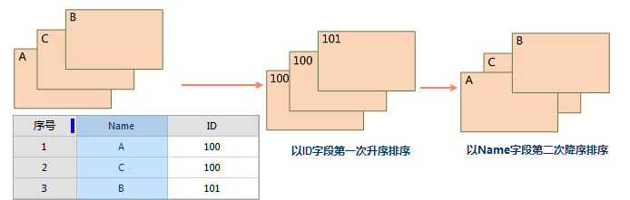 如下图所示:调整 A、B、C 三个对象的显示顺序,先按照 ID 字段进行第一次升序排序,再以第二字段 Name 进行降序排序,得到如下图所示的结果。