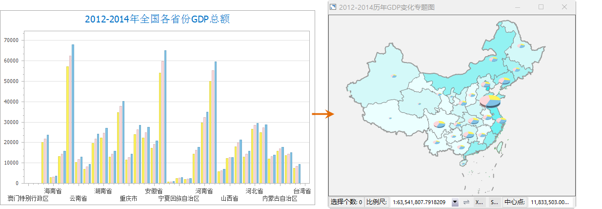 示例:下图为将2012-2014年全国各省GDP柱状图转换为单值专题图和统计专题图。