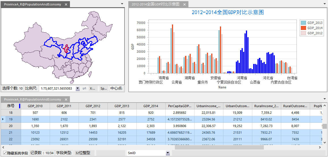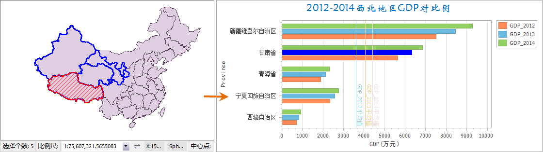 - 例如在全国范围内单独统计西北五省的GDP情况,即在地图窗口中选择该五个省份的图形对象,按照如上操作制作西北地区2012-2014年GDP对比图。得到如下结果: