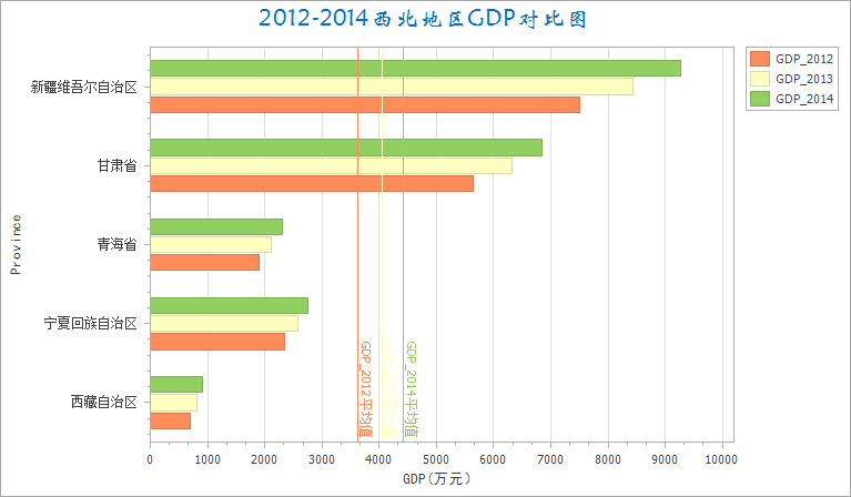 通过此类数值表达方式,能够直观的了解分类数值之间的相对差异。例如:创建一个条形图,对西北五省2012-2014年GDP进行对比。